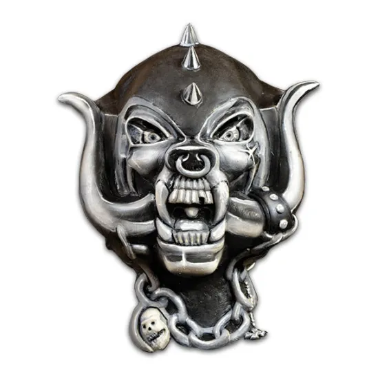 Trick or Treat Studios is proud to present the officially licensed Motorhead – Warpig Mask. Sculpted using the inspiration of images originally created by artist Joe Petagno in 1977 for the cover of the Motorhead album and in many variations on covers of ensuing albums, this masks captures the band’s distinctive fanged-face logo, featuring over-sized boar’s tusks, chains, and spikes. The fanged face has been referred to variously as Warpig and Snaggletooth and this is the first ever official mask made in its likeness. Get yourself the Motorhead – Warpig Mask and rock out this Halloween!