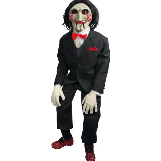 Jigsaw’s main accomplice and icon of the film franchise, the officially licensed, Saw – Billy the Puppet Deluxe Prop is a must for any collector. This amazing prop is 1:1 scale features a vinyl head, moving mouth, light-up eyes, posable arms and hands, plush legs and a weighted torso for easy sitting. Pressing the wrist plays 2 sound clips right from the film.