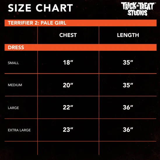 Trick or Treat Studios is proud to present the officially licensed, Terrifier 2 – Pale Girl Costume! This amazing costume was developed by taking the screen-used costume, kindly loaned to us by the production, and sending it to our factories for one-to-one replication. Every detail of the Pale Girl costume is represented in this incredible replica.